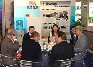 左图为英国Channel公司的董事长和总经理Robinson父子在展会上洽谈商务。 下图为豹驰实业公司展台上中外客商踊跃的场面。 |