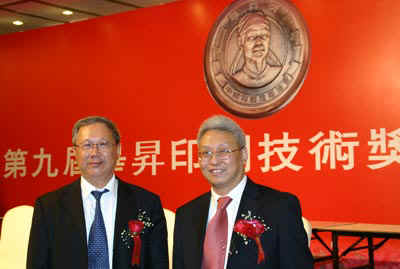 豹驰集团董事长程康英先生(右)获第九届毕升印刷技术新人奖后与国家新闻出版总署副署长、中国印刷技术协会理事长于永湛先生合影留念。