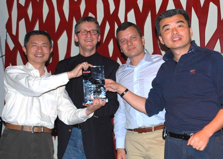 北京豹驰公司总经理杨晓明(左一)参加颁奖典礼。颁奖人:柯达图文影像集团大中华区总裁王兵先生(右一);数码印刷解决方案亚太区总经理 Mr. Lois Lebegue (右二)