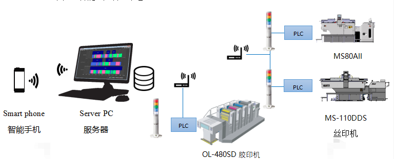 在任何一级印刷厂都会有多台机器同时在线工作,包括制版机、印刷机(如胶印机、网印机、各种特印机)、以及后道的模切机、装订机等机型。智能工厂概念中的“工厂”其实指的是所有的机器,“智能”指的是使用智能化的方式对所有的机器进行管理,如图3中显示的用服务器连接起各机型的现场模型。